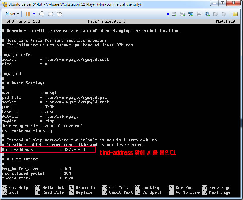 bind-address 앞에 # 을 추가한다. 그리고 Ctrl+X → Y 입력 → 엔터 키를 눌러 저장한다.