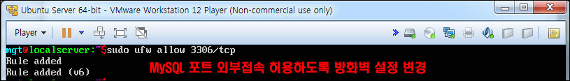# MySQL 포트 외부접속 허용 sudo ufw allow (MySQL 포트번호)/tcp |