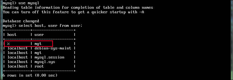 생성한 사용자 계정을 조회해 보자 먼저 mysql 데이터베이스를 선택하여 user 테이블을 조회한다. 조회 결과를 보면 방금 생성한 계정과 접속 가능한 host가 나온다.