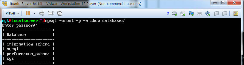 # MySQL root 계정 접속, 데이터베이스 조회 mysql -uroot -p -e'show databases' |