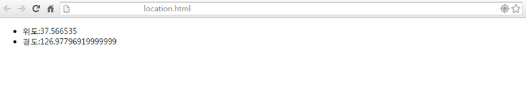 <!DOCTYPE html> <html> <head> <meta charset="UTF-8"> <title>Insert title here</title> <script src="whereami.js"></script> </head> <body> <div id="myLocationInfo"></div> <script> // 나의 위치정보를 출력할 객체 구하기 var elt = document.getElementById("myLocationInfo");