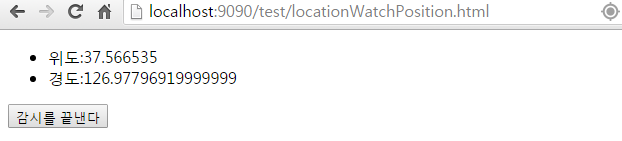 }); </script> </head> <body> <ul> <li>위도:<span id="latitude"></span></li> <li>경도:<span id="longitude"></span></li> </ul> <input id="btnStop" type="button" value="감시를 끝낸다" /> </body> </html> |