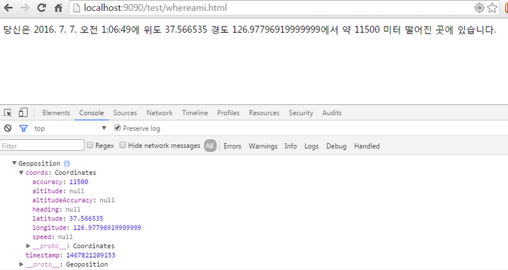 // 항상 가져올 수 있는 필드들이다. timestamp는 coords 객체 내부에 있지 않고, // 외부에서 가져오는 필드라는 점에 주의하다. var msg = "당신은 " + new Date(pos.timestamp).toLocaleString() + "에 " + " 위도 " + pos.coords.latitude + " 경도 " + pos.coords.longitude + "에서 "+ " 약 " + pos.coords.accuracy + " 미터 떨어진 곳에 있습니다.";