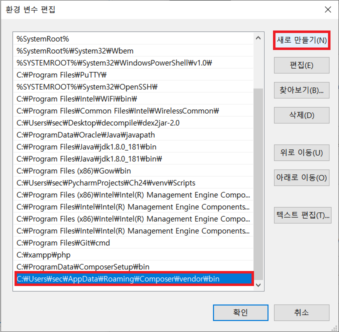 [새로 만들기] → " C:\Users\[사용자 명]\AppData\Roaming\Composer\vendor\bin "