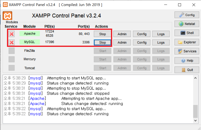 apache, mysql 서비스 컨트롤 및 로그창 확인 가능