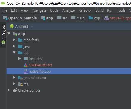 Native C++ 템플릿을 선택 후 프로젝트를 생성할 경우 일반적인 안드로이드 프로젝트와 달리 cpp 폴더와 내부에 native-lib.cpp 파일이 함께 생성된다.