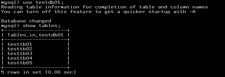 특정 DB만 복원되는지 테스트를 위해 처음에 생성해두었던 testdb01 DB의 전체 테이블을 아래에 명령어의 DB명 부분만 삭제할 테이블의 DB명으로 수정한 후 삭제합니다.