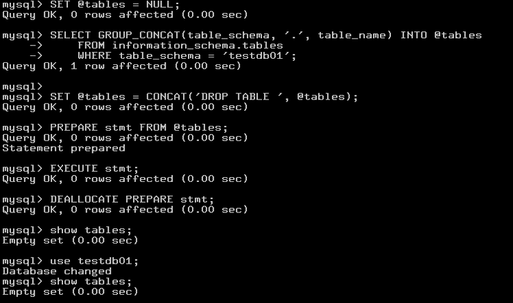 > SET @tables = CONCAT('DROP TABLE ', @tables);