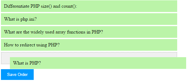 This script contains jQuery functions to make MySQL rows sortable. And also contains function to save new order to the database. This function will implode changed row order and add them to a hidden field.